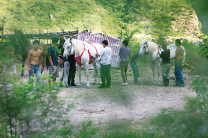 在劇組的馬棚里,記者看到了幾匹純種馬正穿著紅紅綠綠的“肚兜”遛來遛去(小圖),場面相當搞笑。這種“肚兜”由一塊鮮艷的花布和4條帶子組成,帶子穿過馬匹的前腿系在它們的背上,正好包裹住馬匹的胸腹部位。大多數工作人員都不明白這種“馬肚兜”是做什么用的,只說這是導演姜文的主意,只有一位工作人員透露說,這種“肚兜”是馬幫的標致。記者 楊蓮潔