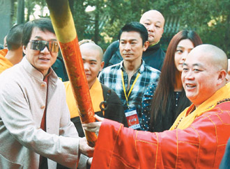 中新網(wǎng)10月23日電 劉德華將在新片《新少林寺》中拜成龍為師學功夫!昨天河南少林寺的寧靜被打破,宣揚武術精神的《新少林寺》開鏡,成龍、劉德華、謝霆鋒、范冰冰、吳京齊聚少林寺,現(xiàn)場貴賓、武校學生見到巨星全變粉絲,拚命圍上前來,場面一度失控,成龍則發(fā)揮大哥本色指揮現(xiàn)場,呼吁大家維持秩序。
