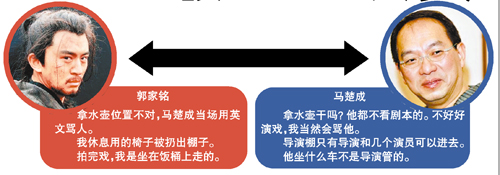馬楚成說:“我對郭家銘是有意見。我是很少罵人的導(dǎo)演,為什么我罵了他?為什么片場的化妝、梳頭這些工作人員都不喜歡他?我覺得他應(yīng)該檢討一下自己。他的戲演得不好,我讓他演一場醉酒的戲,開拍之前他喝了很多酒,正式拍的時候他竟然醉到了沒法拍的地步,要第二天重拍。他們那邊又說第二天不行,他要去云南拍一個電視劇。我很生氣,因為他們進組前告訴我說已經(jīng)推掉了云南那個戲,怎么能刻意騙人呢?搞得我們的戲卡在那里。再說他拿著水壺的那場戲,他都不看劇本的,大家都沒水喝了,他拿那么大壺水干嗎?自己不好好演戲,我當(dāng)然會罵他啦。我讓他演戲不要那么夸張,他不聽,當(dāng)自己大牌,那我就只好刪他的戲了。他還不斷地問我為什么不拍他的特寫,這部戲叫做《花木蘭》哦,每個群眾演員、每個小角色都給很多特寫,這戲還怎么演?”