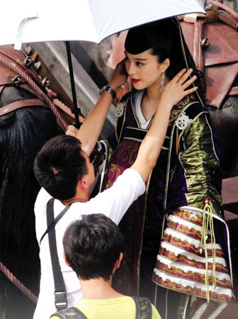 陳凱歌新片《趙氏孤兒》正在寧波趕拍,范冰冰的孕婦造型日前浮出水面。當天正在拍攝一場趙朔攜莊姬進城見晉王的戲份。范冰冰扮演的莊姬華服綾羅地端坐在馬車內,黑紗遮面,被趙文卓緊緊牽著。莊姬是“趙氏孤兒”趙武的生母,也是片中分量最重的女性角色。導演一喊卡,立即有三四個助手沖上去攙扶范冰冰下車,范冰冰以腹部高聳的造型亮相。雖然范冰冰早前在《蘋果》中也扮演過孕婦角色,不過像這樣夸張的“十月臨盆”的大肚造型還是比較罕見的。(辛文)