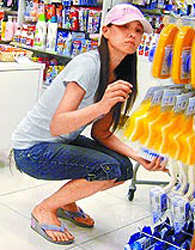 她昨天脂粉未施逛賣場,還直接蹲在地上,先買1瓶天然養生醋,又買入浴劑,逛到開架式化妝品,又買了唇蜜及眼影。
