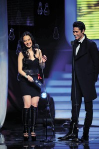 2009MTV超級盛典昨天在大劇院舉行。成龍、莫文蔚、WonderGirls、飛輪海齊齊成為座上賓,可誰都沒有阿嬌遭遇如此大的尷尬與障礙。先是因為贊助商與自己代言的品牌沖突,導致電視臺拍攝的畫面無法播出,后是在臺上與混血模特無法用英文順暢交流,令她在臺上連喊“尷尬”。