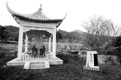 家族墓地是坐北朝南,正中間是侯寶林夫妻的墓地,有特色的是兩人的“棲息地”是在一個(gè)白色亭子里。老兩口的雕像各自“坐”在凳子上,悠閑地聊天、對(duì)望。
