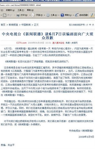 2天后的6月9日,央視在官方網站首頁的顯要位置,發表“中央電視臺‘新聞聯播’就6月7日誤編畫面向廣大觀眾致歉”的消息。