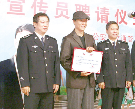 在熱播電視劇《潛伏》中成功扮演地下黨員余則成的影視明星孫紅雷,今日又多了一個身份———交通安全宣傳員。今天上午11點半,孫紅雷在眾多媒體“咔咔”作響的鎂光燈下,從公安部交通管理局局長楊鈞手里接過大紅的“交通安全宣傳員”證書,正式成為公安部交通管理局聘請的首位交通安全公益宣傳明星。