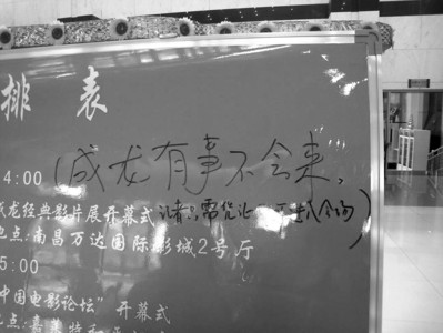 但有趣的是,記者們?cè)陔娪肮?jié)“指定酒店”的大堂信息欄發(fā)現(xiàn)了這樣一行大字:“成龍有事不會(huì)來(lái)。 ”記者們看后紛紛大笑,并用相機(jī)拍下了這個(gè)有意思的畫(huà)面,這句話也迅速成為記者圈內(nèi)的一句流行語(yǔ)。記者 于音