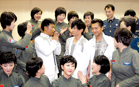 16位曾翱翔的藍天上的女飛行員們,一股腦兒地擠上前去與偶像合影,當紅女星閆妮則一掃平日里的害羞個性,看到小虎隊三人時像個小粉絲一樣跳起來表達著自己的興奮之情。一片混亂中,有位央視的記者一不留神被擠掉入彩排大廳一號入口處的水池里。某家網(wǎng)站的攝像記者在跟隨著小虎隊的步伐倒退著拍照時,突然流下眼淚,之后他對同行說:“鏡頭一推上去,實在是觸景生情,可能是太久沒有看到他們?nèi)齻人一起出現(xiàn)了。”