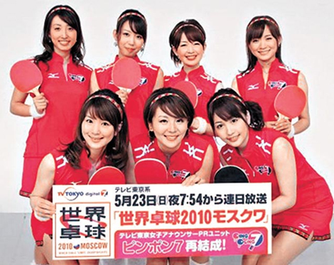 中新網4月19日電 日本東京電視臺去年轉播橫濱世界乒乓球賽,讓一批美女主播組成“乒乓 7”組合報道賽事,結果收視創下同類體育節目新高。世界乒乓球賽下月 23日在莫斯科開打,東京電視臺決定重召“乒乓”,眾美女主播更以火辣辣超短紅裙亮相拼收視。