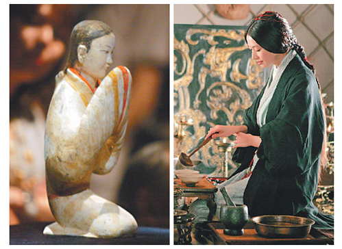 相較于歷史博物館“微笑彩俑”展里的跽坐拱手俑,葉錦添分析,林志玲在《赤壁》里的發(fā)型和服裝都與拱手俑相仿,優(yōu)雅的跽坐美姿讓它化為永恒。
