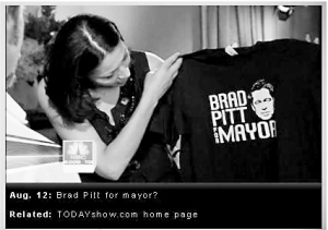 現在,市長競選的宣傳工作已經啟動,除了競選徽章出爐,還有許多市民從7月份開始身穿印有“Brad Pitt for Mayor(選布拉德·皮特當市長)”字樣的T恤。該T恤在當地賣到20美元一件。