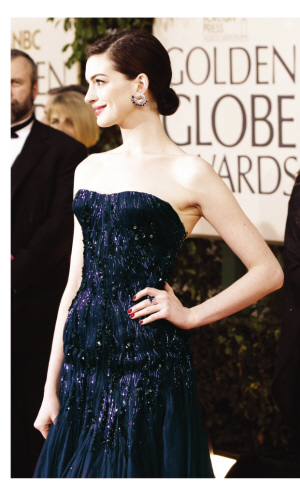 雖然沒有領(lǐng)到“金球”,但是安妮·海瑟薇在紅地毯上分外搶眼,鑲有藍(lán)色寶石的孔雀型耳環(huán)與寶石藍(lán)金絲裹胸禮服相得益彰。