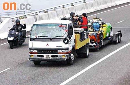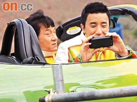 昨日清晨七時,成龍與祖名穿超時空戰士的“父子裝”抵達青馬大橋,駕駛熒光黃色和綠色的左跑車,車尾則放了一大箱冰凍道具樽裝茶,非常搶眼。坐在司機位的成龍在公路上風馳電掣,狀甚威風,其實他們的跑車被固定在貨車托尾板上,相反攝影師要站在托尾板上拍攝,當有大風或大貨車經過扯風時,令攝影師搖搖欲墜,驚險萬分。