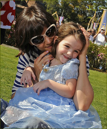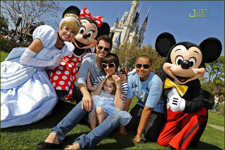 好萊塢第一包包蘇瑞身穿粉藍色連衣裙,手牽米奇和米妮,好似迪斯尼的小公主,而克魯斯身為老爹也不忘將這一幕及時收入鏡頭之中。