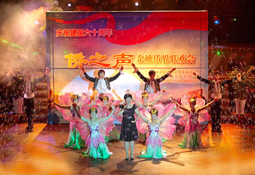 中新網9月29日電 明月迎中秋,團圓慶國慶。9月27日,寧波余姚市僑務系統首次舉行了具有“僑”之特色的文娛活動——“僑之聲”余姚市僑界慶祝新中國成立60周年聯歡會。市政協副主席、市委統戰部部長葉文龍,市僑辦主任、僑聯主席黃孟丹等領導出席,全市僑界政協委員、僑聯委員以及部分歸僑僑眷、留學人員及其家屬、僑資僑屬企業家、基層僑務工作者,共計400余人共同歡度了節日的聚會。