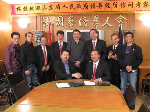 雙方一致同意,今后進一步加強信息交流,互相支持,開展實質性合作。山東省海外交流協會副會長史進與華僑華人會會長陳勝武在友好關系協議書上簽字。