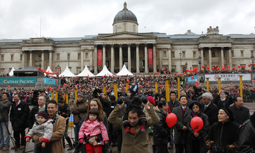 中新網2月22日電 2月21日中午,近三十萬英國華僑華人及當地民眾匯集在倫敦特拉法加廣場,共同觀賞了由中國國務院僑辦副主任任啟亮率領的“文化中國•四海同春”藝術團的精彩演出。中央民族歌舞團極具民族特色的歌舞和著名歌唱家劉斌、呂薇、桐瑤的傾情表演深深地打動了數以十萬計的觀眾,使廣大旅英僑胞在春寒料峭中感受到了來自祖(籍)國的溫暖,也使在場的外國朋友領略到中華文化的魅力。