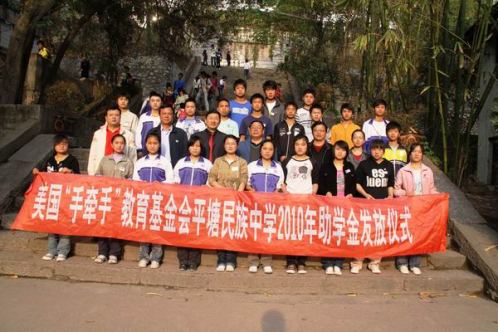 中新網4月26日電 據貴州省僑聯消息,2010年4月20日,美國手牽手教育基金會上學期助學金發放儀式在平塘民族中學舉行。54名貧困學生再次得到17476元愛心資助。州僑聯副主席楊宣貴、縣政協副主席、縣委統戰部部長嚴福先參加了助學金發放儀式,并作了講話。