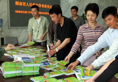 12日《實施辦法》集中宣傳日上,省外僑辦官員章定國、郝去吾、符華興、黎里溪、劉曉越、龐力平等人和全體干部職工及下屬單位代表70余人每人領取了一份《實施辦法》,并進行了集中學習。