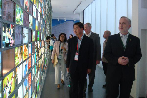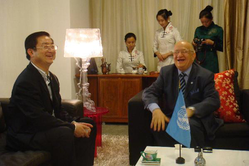 在聯合國館項目服務商、美國全美蘇浙同鄉總會會長朱元忠的陪同下,崔明華一行又參觀了上海世博會聯合國館,并體驗了在聯合國館內舉行的中國茶藝表演,并于聯合國副秘書長阿瓦尼·貝南進行了親切的會談。崔明華最后也在留言薄上題詞:“和諧之理念,發展之動力。”