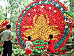 隨著澳門回歸時間日益臨近,中國內地慶祝氣氛漸濃。四川省宜賓市流杯池公園內,用數千個民間工藝制作的飛輪扎成慶澳門回歸造型,分外引人注目。