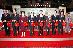 澳門回歸祖國大型展覽十一日在澳門開幕,澳門特區(qū)首任行政長官何厚鏵、新華社澳門分社社長王啟人、澳門中華總商會(huì)會(huì)長馬萬祺等嘉賓為展覽剪彩。