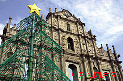 澳門大三巴古老的牌坊前新搭建圣誕燈飾,為即將回歸增添節(jié)日氣氛。 中新社傳真