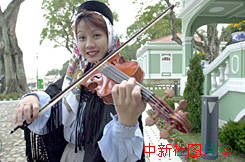 澳門回歸前夕,各種慶祝活動紛紛拉開序幕,一位澳門少女身穿葡國鄉村服飾,在修整一新的住宅博物館前演奏。