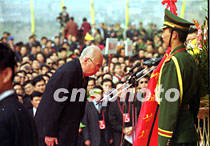 圖文:海內外華夏子孫公祭黃帝陵 2001年4月6日 08:01 ![]() 陜西黃帝陵大祭祖。中新社記者 宋吉河 攝 ![]() 王光英向軒轅黃帝畫像敬獻花籃。中新社記者 宋吉河 攝 ![]() 萬國權向軒轅黃帝畫像敬獻花籃。中新社記者 宋吉河 攝 中新社西安四月五日電(王彥平)清明節的黃帝陵,雨后初霽,陽光普照,農歷辛巳年公祭軒轅黃帝典禮今天在此隆重舉行。 今天在象征九五之尊的九點五十分,公祭典禮正式開始。全場肅立后,代表三十四個省、市、自治區和特別行政區的三十四響禮炮響起,人們的目光投向空中,仿佛在聆聽中國十二億九千五百萬華夏子孫和眾多海外同胞向中華人文初祖所要表達的殷殷懷念與追思。 海內外各界參祭代表,在入口廣場肅立靜候片刻后,隨古樸、莊嚴的祭祀儀俯隊,過軒轅橋觀龍尾道,來到軒轅廟前。 隨后鼓樂齊鳴,在威武的禮儀士兵引領下,全國人大常委會副委員長王光英、全國政協副主席萬國權等分別向黃帝像敬獻花籃。 在身著盛裝的禮儀小姐們向始祖敬獻了鮮花、時果等祭品后,陜西省省長程安東恭讀了辛巳年清明公祭軒轅黃帝祭文。 最后,所有參祭的各界代表向黃帝像行三鞠躬大禮。(完) |