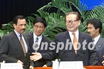 圖文:江澤民會見文萊蘇丹 2001年5月15日 15:45 ![]() 中國國家主席江澤民與文萊蘇丹博爾基亞,十五日在北京人民大會堂出席APEC人力資源能力建設高峰會開幕式。中新社記者 毛建軍 攝