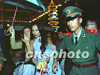 中國著名歌唱演員韋唯3日晚在浙江湖州演出后,由武警戰士護衛從后臺走向休息室。中新社記者 趙振清 攝
