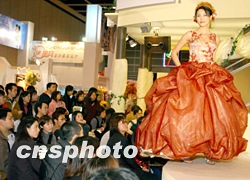 規模盛大的香港婚紗展2月2日在香港會展中心開幕,除了傳統的白色婚紗外紅色婚紗格外受歡迎。中新社傳真任晨鳴攝