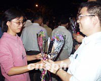 圖:海南元宵換花節(jié) 青年當(dāng)街互換花 2002年02月27日 10:48 ![]() 元宵佳節(jié),海南省瓊山市舉辦民間元宵換花節(jié),近十萬市民參與了當(dāng)晚的賞燈換花活動。圖為一對男女青年當(dāng)街相互換花,有情人以此連理。中新社圖 王辛莉 攝