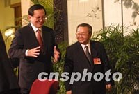 ![]() 中國外交部長唐家璇與九屆全國人大五次會議新聞發言人曾建徽,六日走出人民大會堂記者招待會現場。唐家璇在會上說,中國入世有利于香港繼續維持包括國際金融中心在內的三個國際中心地位。中新社記者 劉殊瑾 攝