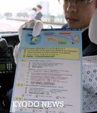 日本出租車以四國(guó)語(yǔ)言接待客人 其中包括中文 2002年03月12日 08:36 ![]() 用四國(guó)語(yǔ)言記有付錢方法等內(nèi)容的“輕松乘坐出租車傳單”(共同社)