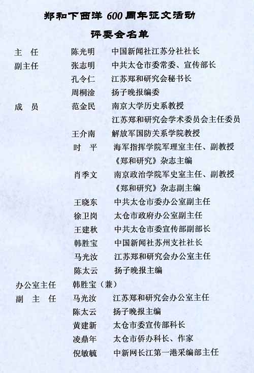 “鄭和下西洋600周年”征文啟示 2002年07月05日 10:36 ![]() 鄭和下西洋600周年征文活動評委會名單 為紀念鄭和下西洋600周年,弘揚鄭和開放和探險精神,進一步提升鄭和七下西洋起錨地太倉的知名度,促進太倉的兩個文明建設和經濟發展,特舉行征文活動。 一、征文時間 從2002年7月11日起(鄭和下西洋紀念日)至2003年7月11日止。 二、征文內容 圍繞鄭和七下西洋起錨地太倉與鄭和,從歷史與現實的結合上,從跨越600年的時間和空間中,從不同視角充分展示鄭和精神及給太倉歷史、經濟、文化等方面帶來的影響。 三、征文形式 1、學術論文類; 2、文學類,包括小說、散文、隨筆、詩歌、故事、盈聯等; 3、新聞類,包括消息、通訊、特寫、專訪、述評等。 四、征文字數 論文一般不超過5000字;文學作品一般不超過3000字(長、中篇小說例外);新聞一般不超過1500字。 五、征文刊用 征文作品在中新江蘇網、中新網長江第一港、揚子晚報“聚焦蘇錫!睂0、《鄭和研究》雜志刊用。 六、征文評比 征文頒獎活動在2003年9月份舉行,評出論文類、文學類、新聞類一等獎各一名,獎金3000元;二等獎各三名,獎金1500元;三等獎各五名,獎金500元,另評出榮譽獎若干名。 七、征文請寄江蘇省太倉市體育東路58號,中新網長江第一港編輯部,郵編215400。另電子文檔以word形式保存,寄jiangzhenjiang@chinanews.com.cn作者請自留底稿,所有應征作品一律不退稿。 八、本次征文活動解釋權在征文活動組委會。 主辦單位:太倉市委、市人民政府 中國新聞社江蘇分社 揚子晚報“聚焦蘇錫!本庉嫴 江蘇鄭和研究會 二OO二年七月一日