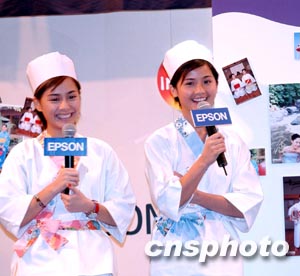 香港偶像組合Twins雙生兒蔡卓妍及鍾欣桐,7月16日打扮成為日本壽司師父出席EPSON新型彩色噴墨打印機推介會,介紹Twins寫真珍藏集打印的照片。中新社傳真 洪少葵 攝