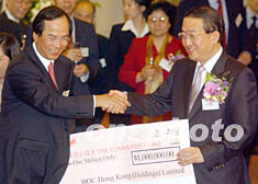 ![]() "中銀香港(控股)有限公司"7月25日成功在香港上市掛牌后,中國銀行副董事長,中銀香港(控股)有限公司、中國銀行(香港)有限公司副董事長及總裁劉金寶(右)向香港公益金籌款委員會主席柯清輝贈送一百萬港元支票。任晨鳴 攝
