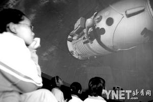 抬頭仰望,漫天的星斗。北京57中學(xué)的學(xué)生坐在學(xué)校的穹幕劇場(chǎng)里,宛如身在太空一樣,月球在他們的頭頂輕輕地轉(zhuǎn)動(dòng)。隨著一聲號(hào)令,嫦娥一號(hào)拔地而起,從他們的頭頂奔向月球。不少的學(xué)生忍不住想要摸一把“嫦娥”,讓“嫦娥”帶著他們一起飛向月球。昨天下午1點(diǎn)30分,初一學(xué)生江聰?shù)稀⑼蹴矀惡屯瑢W(xué)們一起,這樣立體地重溫了“嫦娥”奔月的震撼瞬間。