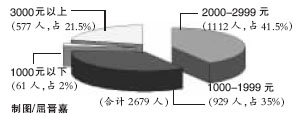 截至昨日,網上調查問及作為一名大學生,希望工作單位給予怎樣的報酬時?參加投票的2679人中,選擇2000元—2999元的最多,為1112人;929人選擇1000元—1999元,選擇1000元以下的為61人,有577人期望3000元以上月薪,即近八成(78%)畢業生期望月薪在3000元以下。
