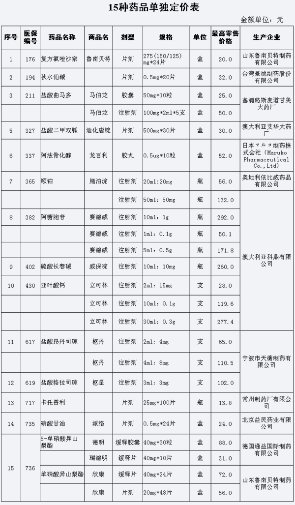 國家發改委公布15種藥品單獨定價方案(附名單)