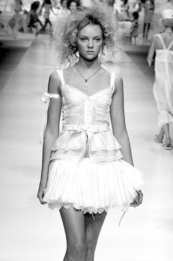 性感亮點:通透面料下面若隱若現的內衣和肌膚,非常吸引人的眼球。D&G本季主打的叛逆少女,就巧妙利用白色蕾絲雪紡的通透感,讓女人的身體猶抱琵琶。