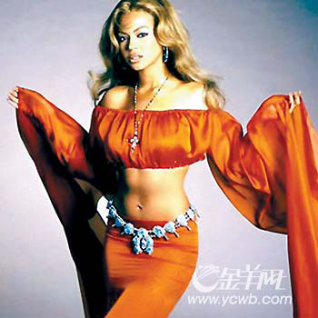 碧昂絲:R&B天后碧昂絲是著名的巧克力美人,穿上這身抹胸式露腰舞袖禮服,瞬間化身成帶有異域風情的阿拉伯美女,禮服那種有點透明感覺的橙色,讓人感覺高貴。