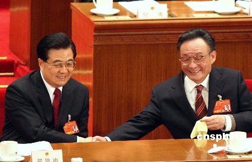 3月8日,十一屆全國人大一次會議第二次全體大會在北京人民大會堂舉行,受十屆全國人大常委會委托,吳邦國委員長作常委會工作報告。圖為報告結束后,胡錦濤與吳邦國握手。中新社發 張宇 攝