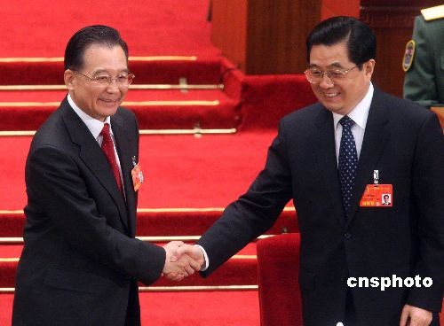 三月十六日上午,十一屆全國人大一次會議在北京人民大會堂舉行第六次全體會議,會議經過投票表決,決定溫家寶為中華人民共和國國務院總理。圖為國家主席胡錦濤祝賀溫家寶再次擔任國務院總理。中新社發 張宇 攝