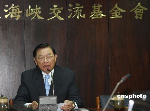 10月21日中午,臺灣海基會董事長江丙坤召開臨時記者會,譴責暴力襲擊來臺灣進行學術(shù)訪問的海協(xié)會副會長、廈門大學傳播學院院長張銘清。中新社發(fā) 耿軍 攝