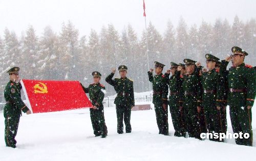 10月20日,武警黑龍江總隊牡丹江市支隊官兵在雪地重溫入黨誓詞。當日,駐守祖國北疆的百余名武警官兵以“瑞雪迎盛會、雪地話黨章”為題,在雪地抒發愛國、愛黨情懷,暢談貫徹落實科學發展觀在警營的極大變化,共話黨的十七大修改黨章的重大意義。中新社發 陳維奇 攝
