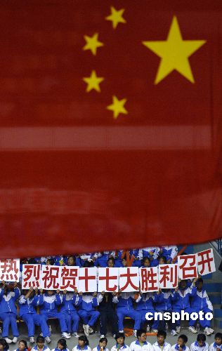 10月20日,2007-2008年全國男排聯賽的江蘇與上海男排比賽在江蘇省淮安體育館舉行,觀眾中的這幾位中學生打出了祝賀中國共產黨第十七大勝利召開的標語。中新社發 淮安曹政 攝