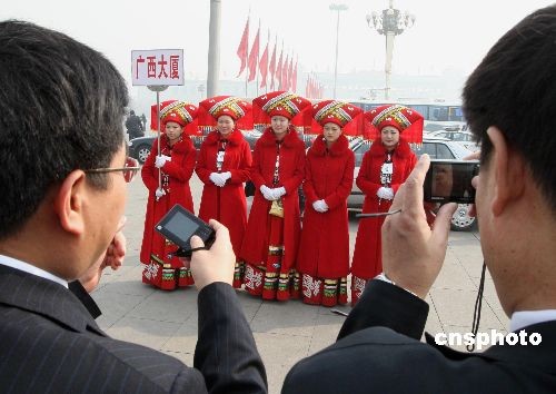 三月十日,十一屆全國人大一次會議在北京舉行第三次全體大會,會議結束后,代表委員忙著抓拍美麗瞬間。中新社發 任海霞 攝