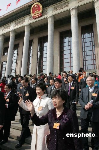 三月十四日上午,全國政協十一屆一次會議在北京人民大會堂閉幕,圖為政協委員步出大會堂時互相揮手告別。中新社發 潘索菲 攝