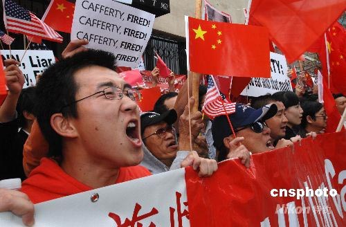 當地時間4月19日上午,留學生張曉龍(前)與華人華僑一起高喊抗議口號。洛杉磯當天爆發十幾年來最大規模的華人華僑抗議示威活動。數千名華人華僑和留學生在CNN洛杉磯分部門前參加和平示威,要求CNN向公開鄭重道歉,并開除卡弗蒂。中新社發 張煒 攝